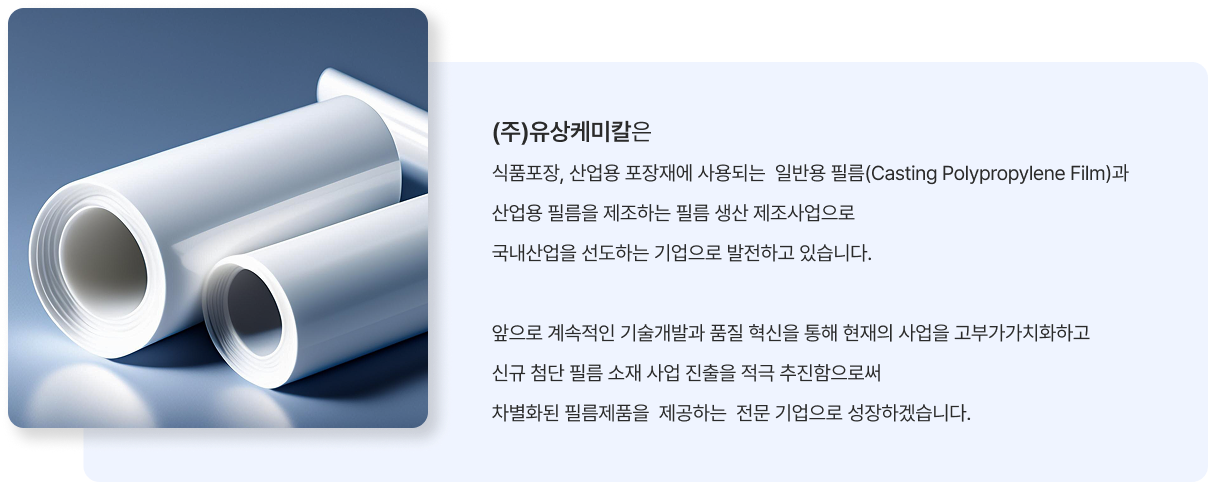 제품개발 및 기술혁신으로 필름제조 선두 기업이 되도록 지속적으로 노력하는 (주)유상케미칼이 되겠습니다.